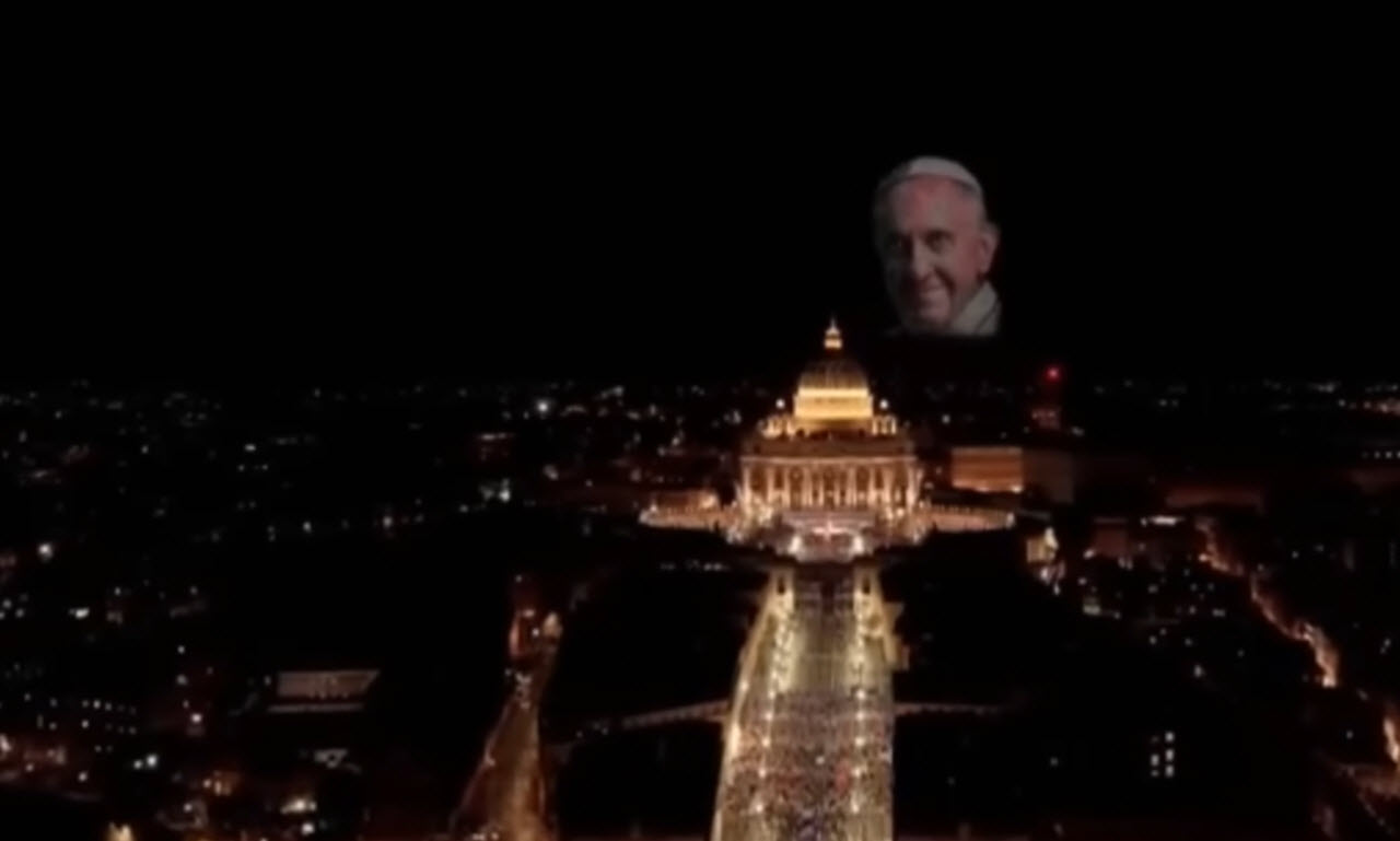 Andrea opened the performance first, steady and confident, backed by a full orchestra filling the square with sound. Above the crowd, drones slowly moved through the dark sky, arranging themselves into an image of the late Pope Francis, who had passed away earlier in April 2023.