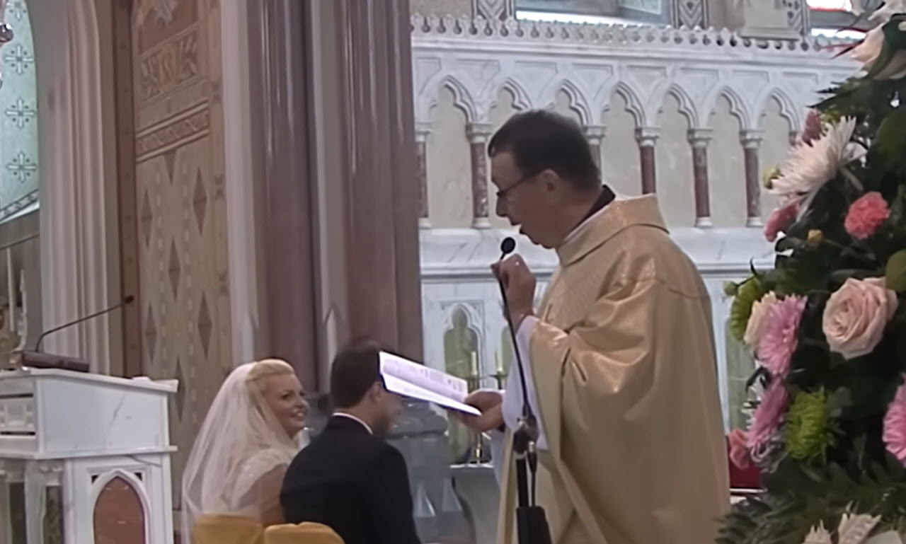 The priest explained a little about them afterward and said: “The bride Leah is from Dublin and the groom Chris is from Cookstown in County Tyrone,” and he went on to say they were having their reception a short distance away and had chosen his church for the ceremony. During the rehearsal, he joked about singing a song for them. The bride agreed but she never expected him to actually do it.