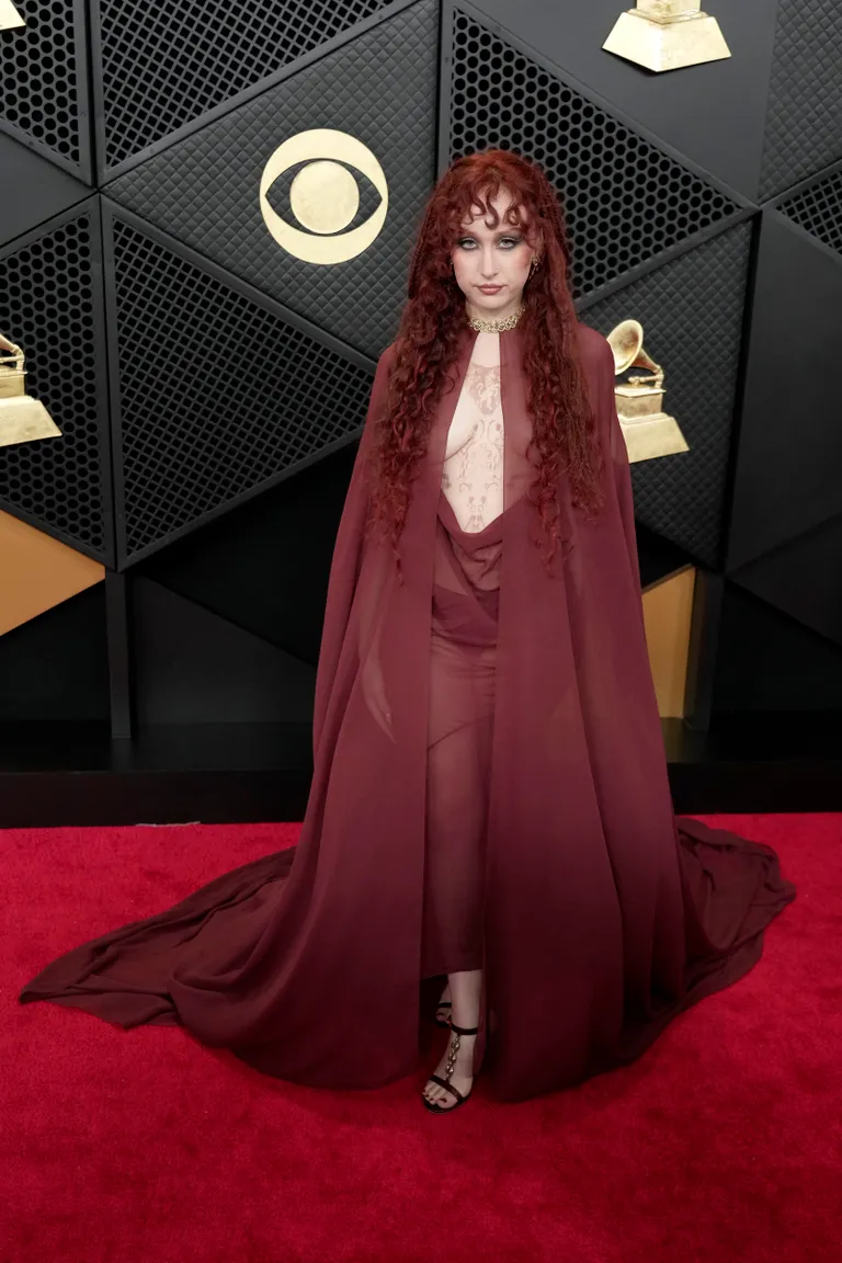 Chappell Roan arrived in a deep rust-toned gown with a plunging neckline and soft draping that blended classic glamour with a modern feel. Her loose red waves matched the warmth of the dress, while minimal accessories kept the focus on color and silhouette.