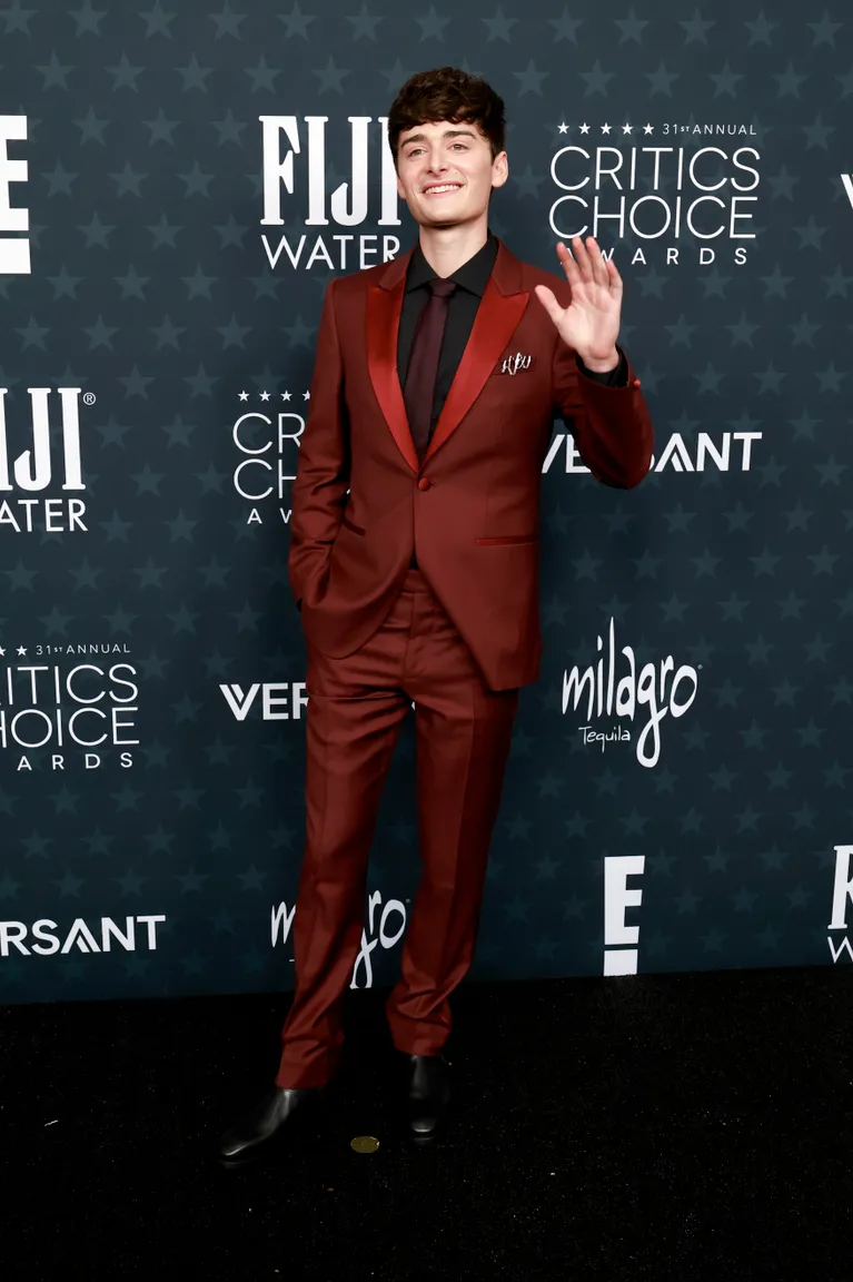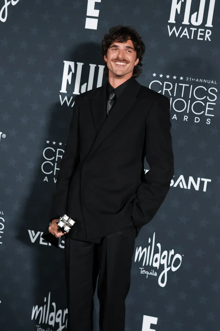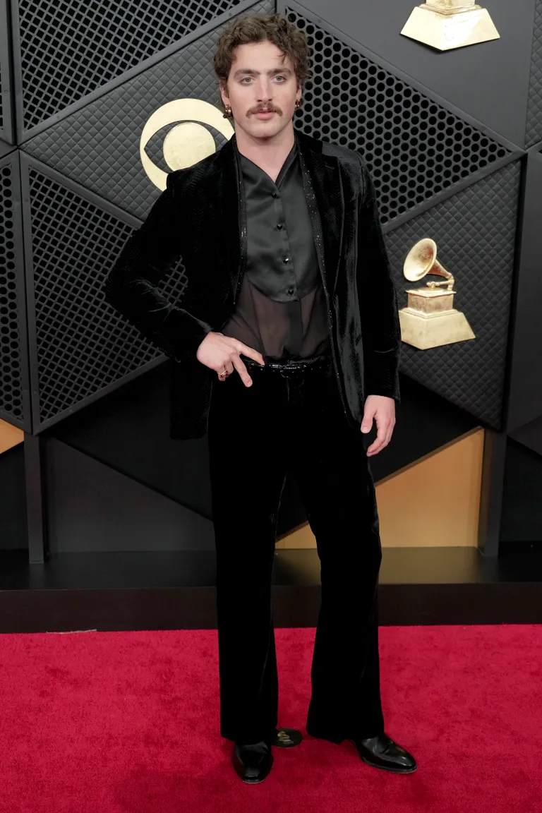 Benson Boone wore a black velvet jacket over a sheer shirt with wide-leg trousers. The tailored look balanced structure and softness for a relaxed red carpet presence.