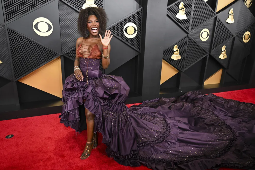 Doechii stood out in a purple gown paired with a burnt orange lace-up corset. The structured bodice and sweeping skirt created bold contrast and movement.