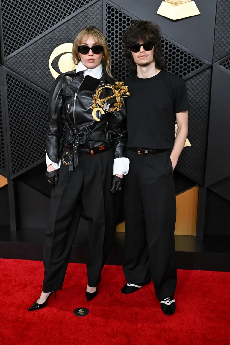 Miley Cyrus and Maxx Morando appeared in coordinated black looks. Her textured, statement styling contrasted with his minimal approach, creating a cohesive pairing.