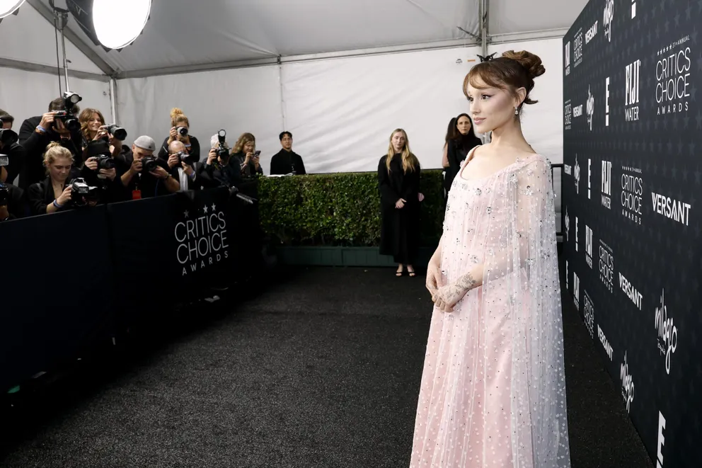 Ariana Grande surprised fans in a soft pink beaded gown with sheer cape sleeves. The romantic look marked a clear shift from her usual red carpet style.