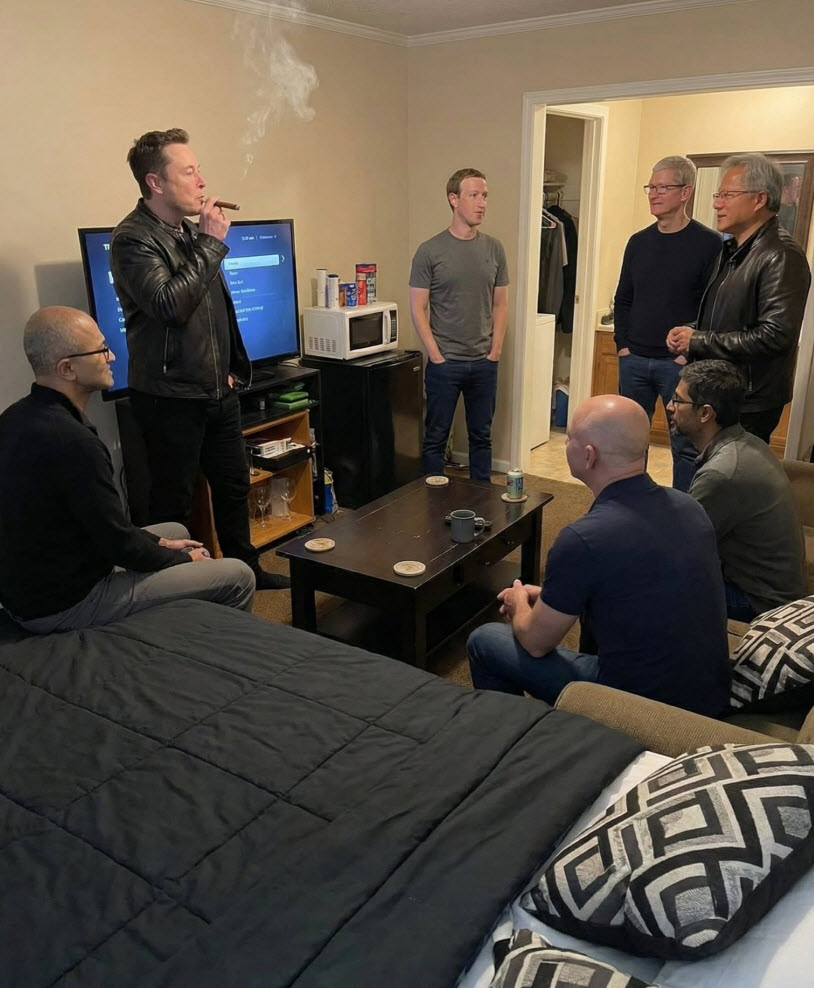 The picture had Mark Zuckerberg, Tim Cook, Sundar Pichai, Satya Nadella, Jensen Huang, and Elon Musk all packed together like they were at a cheap rental trying to hash something out. And the odd part is how normal the whole room looked with a beige wall and a little microwave humming in the corner like nobody bothered to clean things up.