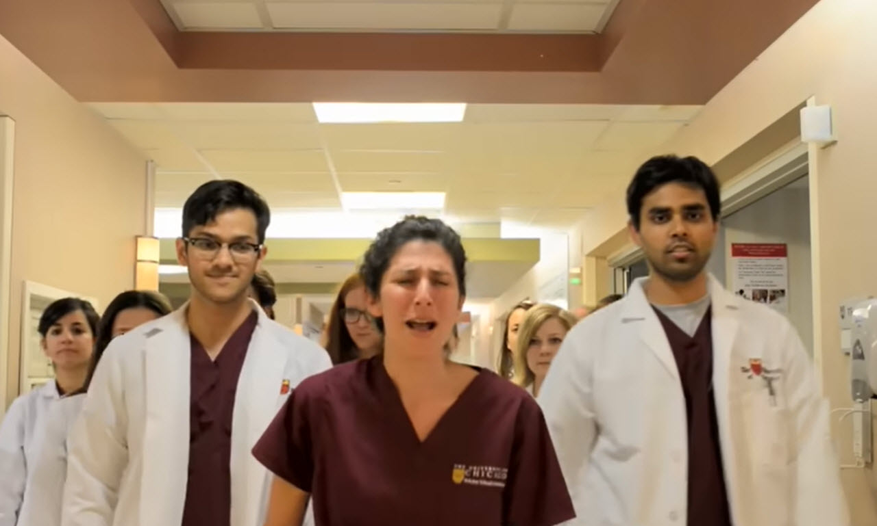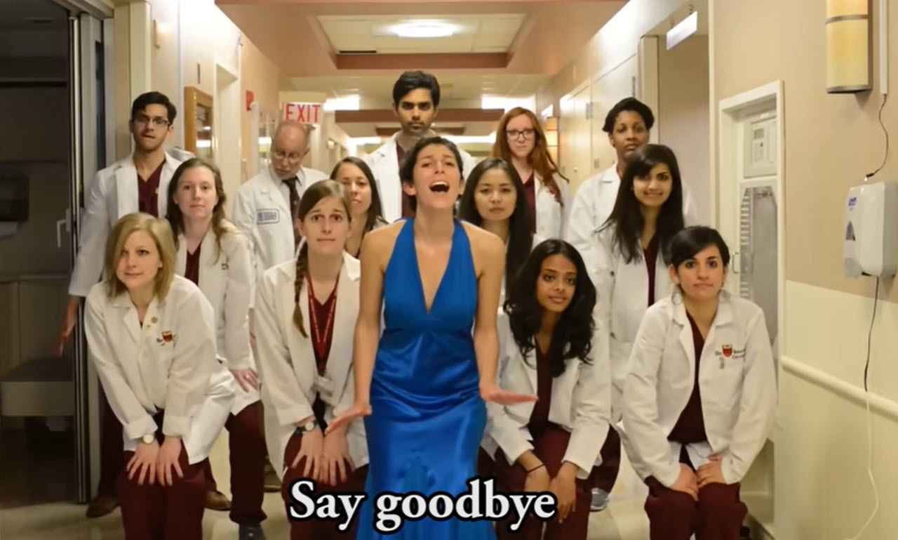 Instead of keeping it simple, they went all in with a full music video filmed inside their medical school. You see students rushing through hallways in scrubs, flipping through books, dancing at hand sanitizer stations, and spinning down corridors on rolling chairs.