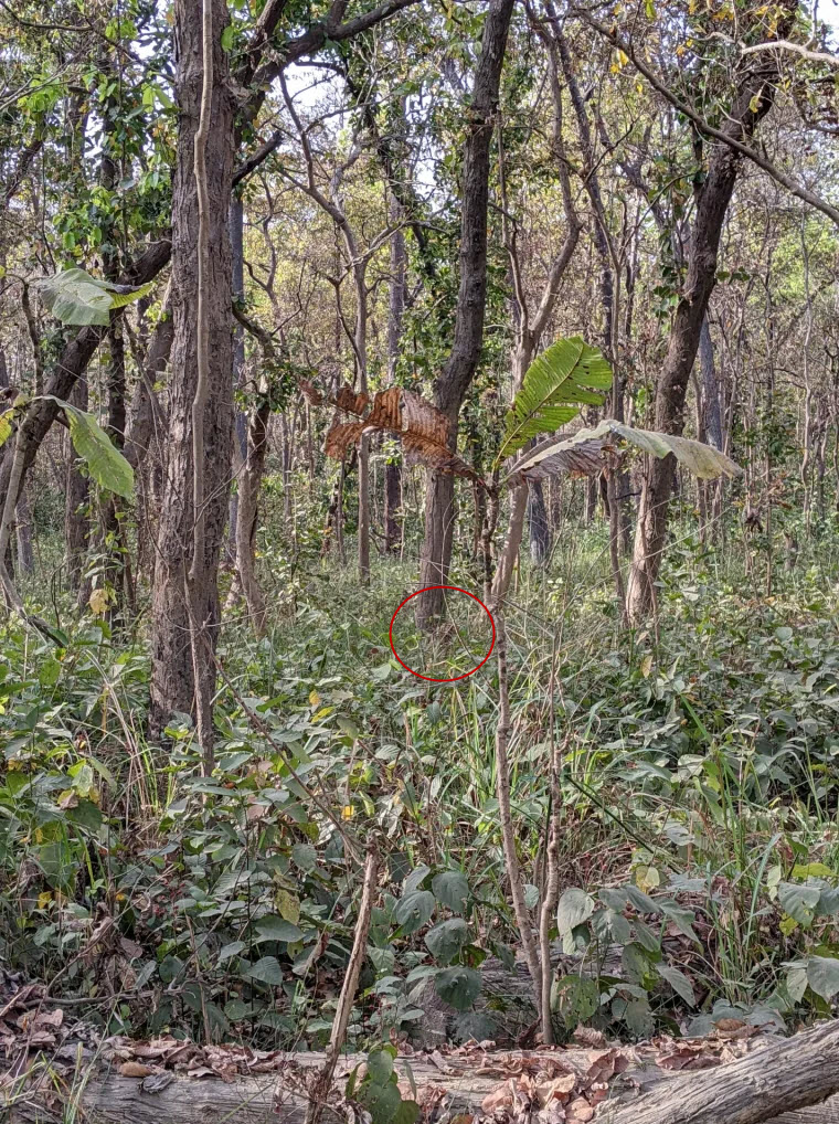 So where is the tiger actually hiding? It turns out the animal is right in the center of the image, crouched in the greenery just below the central tree, blending almost perfectly into the jungle around it.