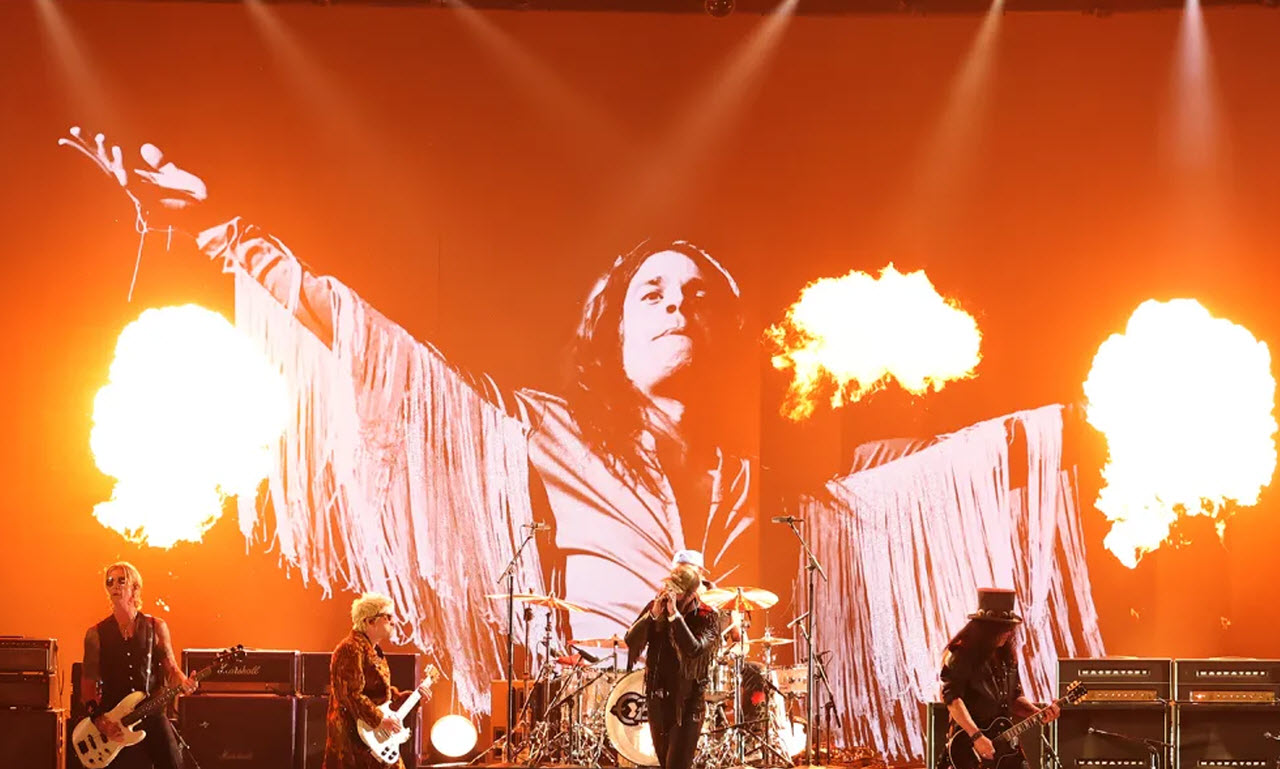 As their performance of Black Sabbath’s “War Pigs” came to an end, a large black and white photo of Ozzy Osbourne filled the screen behind them. The shift from sound to silence landed hard, drawing the audience into a pause that felt deliberate and heavy.